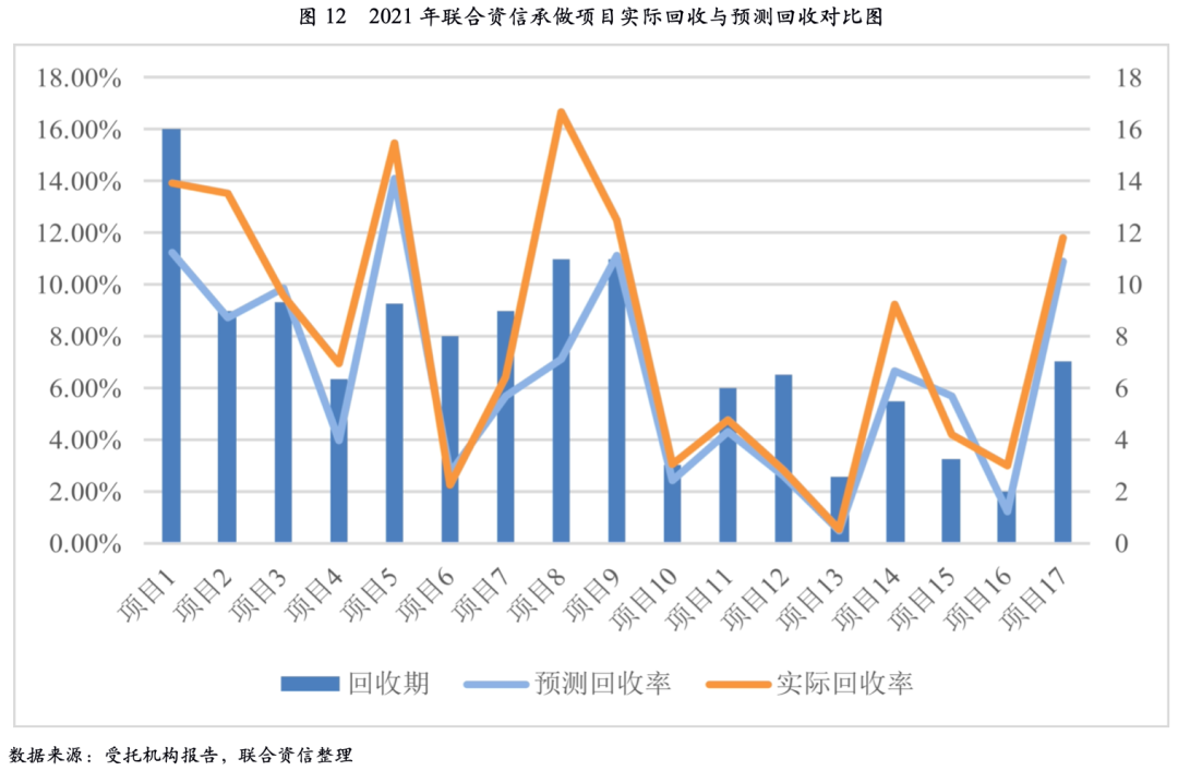 以2021年新發行不良ABS項目為例,截至2021年底,本年度新發行的不良ABS項目中,由聯合資信承做的27單項目中共17單項目已經歷至少1個回收期。從各回收期間的回收數據來看,資產池實際回收大部分略高于初始預測,考慮到未來經濟環境和催收環境變化的影響,實際回收基本符合預期,整體偏差程度不大。