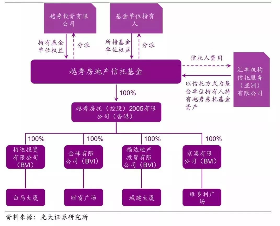香港REITs是以信托方式組成,主要投資于房地產項目的集體投資計劃。該基金旨在向持有人提供來自房地產物業的租金收入回報。具體的交易結構主要包括三個環節:一是將物業注入SPV公司,二是成立信托基金,三是發行信托基金份額募集資金投資于SPV公司,從而獲得物業所有權以及物業所產生的租金收入。為了方便闡述,這里使用YUXIUREITs(越秀房產信托基金)的交易模式作為案例: