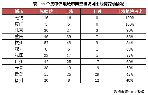 第一類是上漲居多的城市,譬如無錫、廈門、北京、重慶、杭州、深圳、沈陽等城市,這類城市或是不限價,譬如重慶本次集中土拍有22宗地成交溢價率超過50%,占成交地塊的48%;或是樓市表現較佳的城市,譬如杭州,在互聯網經濟的帶動下,城市綜合實力明顯提升,常住人口快速提升,購房需求的支撐性較強,因此房企參拍熱情高漲,“上限+自持”幾乎成為杭州本輪土拍的“標配”,成交的57宗土地中,地價上漲的有48余宗,下降的僅9宗。此外,廈門表現也比較突出,雖然首次集中供地僅5宗,但5宗均高溢價成交,尤其是建發競得的湖里地塊,由于有1.32萬㎡的競配建,隱形樓面價高達6.8萬元/㎡,不斷刷新廈門樓板價天花板。