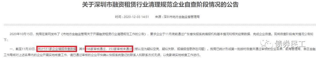 先來看一組數(shù)據(jù)。深圳市地方金融監(jiān)督管理局12月3日披露《關(guān)于深圳市融資租賃行業(yè)清理規(guī)范企業(yè)自查階段情況的公告》,公告中指出:截至11月30日,共計(jì)551家企業(yè)填報(bào)自查數(shù)據(jù),其中198家審核通過,占比為35.93%;353家審核未通過(被認(rèn)定為疑似空殼、疑似失聯(lián),或填報(bào)信息存在問題),占比約為64.07%。雖然融資租賃行空殼、失聯(lián)的現(xiàn)象一直都是比較嚴(yán)重,但是這次深圳官方統(tǒng)計(jì)的這個(gè)數(shù)據(jù),也在一定程度上反映了融資租賃行業(yè)的艱難。