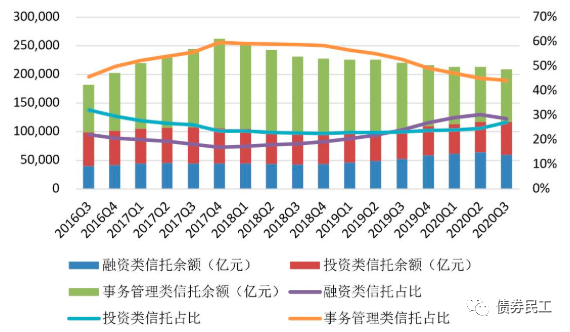 而如果是根據(jù)信托功能分類看,2020年3季度的融資類信托減少了4,966.43億元,信托的融資類功能進(jìn)一步被削弱。