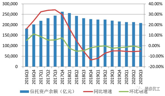 根據(jù)中國信托業(yè)協(xié)會的官方數(shù)據(jù),截至2020年3季度末,信托業(yè)受托管理的信托資產(chǎn)余額為20.86萬億元,較年初減少7,432.79億元,同比下降5.16%;信托資產(chǎn)余額較2季度末減少4,182.31億元,環(huán)比下降1.97%。國內(nèi)的信托資產(chǎn)規(guī)模已經(jīng)是連續(xù)第11個(gè)季度下降。