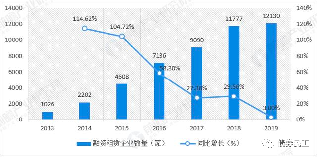根據(jù)租賃聯(lián)合研發(fā)中心會同中國租賃聯(lián)盟、天津?yàn)I海融資租賃研究院組織編寫的《2019中國租賃業(yè)發(fā)展報(bào)告》,2019年中國融資租賃企業(yè)(不含單一項(xiàng)目公司、分公司、SPV公司、港澳臺當(dāng)?shù)刈赓U企業(yè)和收購海外的企業(yè))總數(shù)約為 12130家,較上年增加了353家,增幅約為3%。從增幅數(shù)據(jù)可以看出,融資租賃行業(yè)的數(shù)量幾乎是呈現(xiàn)斷崖式下跌。而最新的截至2020年6月底,全國融資租賃企業(yè)總數(shù)約為12151家,較上年底增加了21家,增幅只有 0.17%。