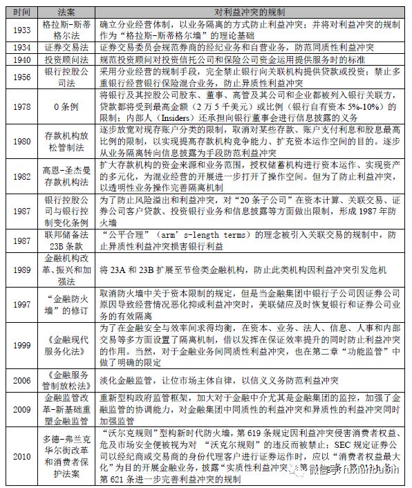 美國為了防止利益沖突而制定和執(zhí)行的法律,主要集中在金融防火墻的制度設(shè)計上,但是基于業(yè)務(wù)的不同,形成了同質(zhì)性和異質(zhì)性兩種不同的利益沖突規(guī)制路徑,“前者(的利益沖突防范機制)主要是針對同質(zhì)性金融機構(gòu)或其關(guān)聯(lián)企業(yè)設(shè)立的,如多功能證券商與銀行集團(tuán)等,(而)后者主要是針對異質(zhì)性金融機構(gòu)的,如由銀行公司、證券公司及保險公司等機構(gòu)所形成的金融企業(yè)集團(tuán)。”對于金融中介利益沖突的法律規(guī)制,在相關(guān)法律的不斷修訂中逐漸形成一個有機的整體: