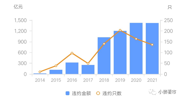 《小債看市》統(tǒng)計,2014-2021年信用債市場共計發(fā)生債券違約836只,違約金額高達5766.18億元。