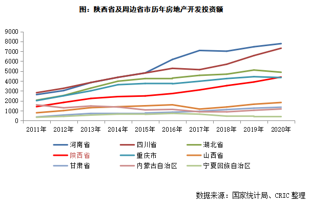 從房地產發展體量上來看,陜西省2020年房地產開發投資額4404億元,全國各地區排名第14,房地產市場整體體量在全國屬于中上游水平。