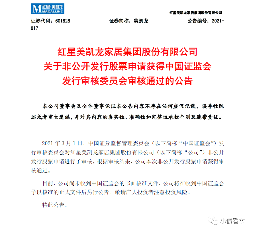 3月1日,紅星美凱龍(601828.SH,01528.HK)公告稱,中國(guó)證監(jiān)會(huì)發(fā)行審核委員會(huì)對(duì)其非公開(kāi)發(fā)行股票申請(qǐng)進(jìn)行了審核。根據(jù)審核結(jié)果,公司本次非公開(kāi)發(fā)行股票申請(qǐng)獲得審核通過(guò)。