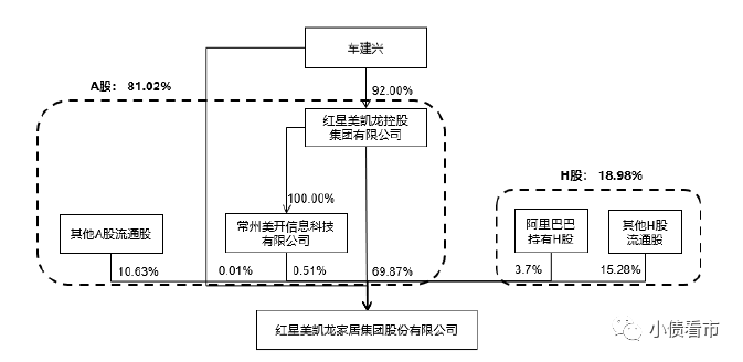 從股權(quán)結(jié)構(gòu)上來(lái)看,紅星美凱龍的控股股東為紅星控股,持股比例為69.87%,穿透后公司實(shí)控人為自然人車建興。