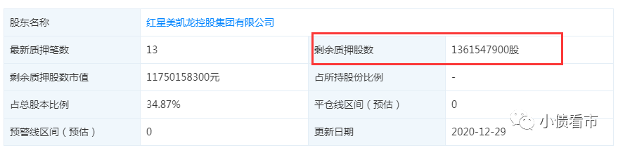 截至2020年末,紅星控股質(zhì)押紅星美凱龍股份13.62億股,占總股本的34.87%,占其所持股數(shù)的49.9%。