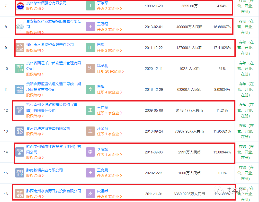 3、2021年12月21日,貴州國資公司成為黔東南州交通旅游建設投資(集團)有限責任公司(中誠信國際和中證鵬元主體信用等級AA,實際控制人黔東南州國資委)持股比例為11.21%的股東。