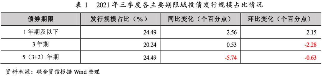 從發行期限上看,三季度城投債仍以中短期為主,1年期及以下發行規模占比同比上升較快,5(3+2)年期發行規模占比同比下降幅度較大。