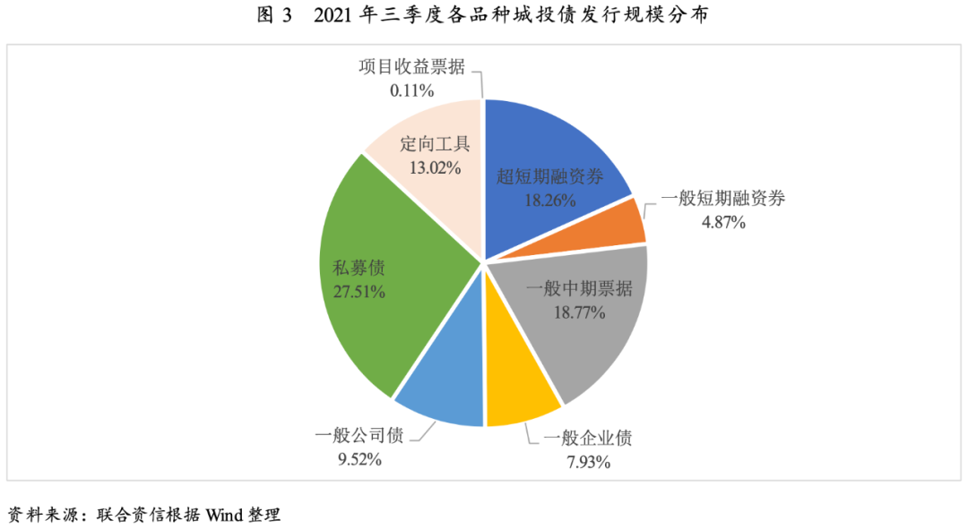 從發行方式看,三季度公募和私募發行城投債規模占比較為均衡;從發行期限看,城投債發行期限仍以中短期為主,1年期及以下城投債發行規模占比環比進一步上升;從債券品種看,仍以私募公司債為主,除企業債外其他品種發行規模環比均有所增長。