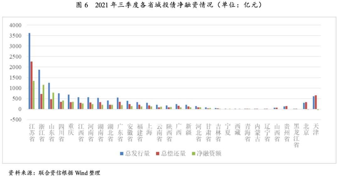 三季度城投債凈融資同比環比均大幅增長,區域分化態勢延續。江蘇省和浙江省凈融資規模保持明顯的領先優勢,山東省和重慶市的凈融資規模環比增幅顯著;遼寧省、黑龍江省、內蒙古自治區、天津等地連續多個季度凈融資為負,但凈融資缺口較二季度均明顯收窄。