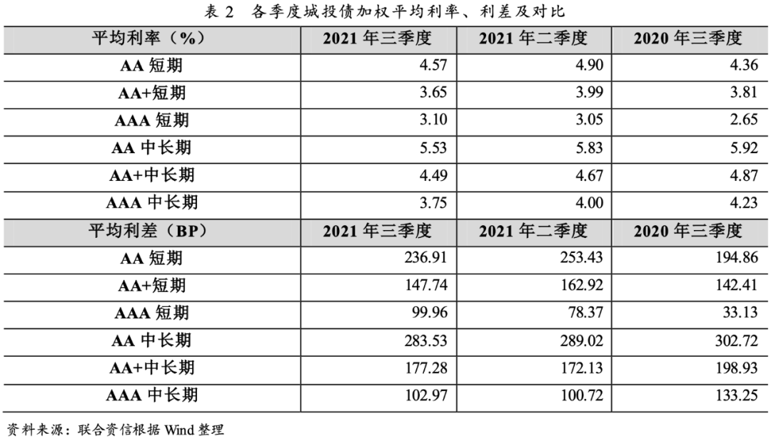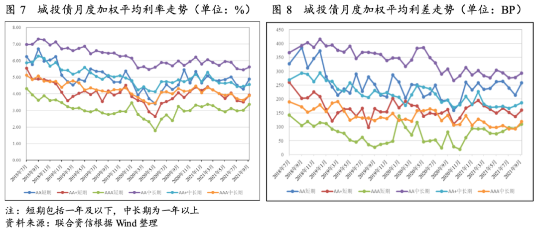 發行利差方面,2021年三季度,AA級各期限城投債發行利差環比均有所下降;AA+級城投債不同期限的發行利差表現不一,短期城投債發行利差環比明顯下降,中長期城投債發行利差略有上升;AAA級城投債發行利差環比均有所走擴。同比方面,受“15號文”等監管政策對城投企業短期流動性造成的影響,短期城投債發行利差同比明顯上升,中長期城投債發行利差同比均明顯下降。分月來看,7月,AAA級短期城投債平均發行利差較6月走擴,其他城投債平均發行利差環比均有所收窄;8月,AA級和AA+級中長期城投債的平均發行利差小幅上升,其他城投債的平均發行利差持續下行;9月,城投債的平均發行利差環比均有所上升。