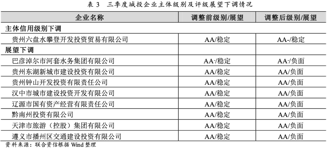三季度,涉及主體級別或評級展望下調的城投企業分布在貴州省、內蒙古自治區、陜西省和天津市,下調原因主要包括償債壓力大、未及時償還金融機構債務、經營情況存在較大不確定性以及擔保代償風險較大等。
