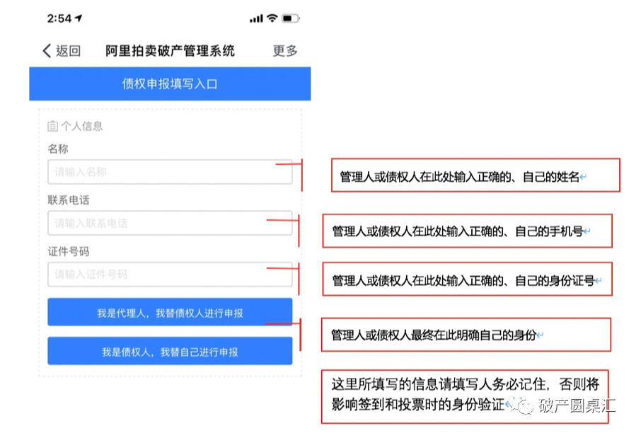 • 無(wú)論代理多少個(gè)債權(quán)人并填寫多少次被代理債權(quán)人的信息,代理人在此處所填寫、輸入的都應(yīng)該是自己的身份信息,系統(tǒng)在收到這些信息后會(huì)自動(dòng)將債權(quán)人信息與代理人“掛鉤”,方便代理人在債權(quán)會(huì)議中進(jìn)行線上投票;