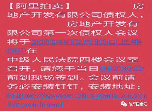 若債權(quán)申報(bào)已經(jīng)結(jié)束,可將制作的包含債權(quán)人、代理人姓名、身份證號(hào)、聯(lián)系電話的債權(quán)申報(bào)表導(dǎo)入釘釘后臺(tái),通過釘釘后臺(tái)給債權(quán)人或代理人群發(fā)邀請(qǐng)鏈接的方式邀請(qǐng)其加入債權(quán)人組織。此種方式的優(yōu)點(diǎn)為:群發(fā)短信方便快捷,缺點(diǎn)為:釘釘?shù)亩绦叛?qǐng)鏈接標(biāo)準(zhǔn)模板只能包含30個(gè)字符,由于字?jǐn)?shù)限制短信不能向債權(quán)人說明詳細(xì)內(nèi)容,會(huì)遺漏重要信息,如果自定義短信模板則需要審核,時(shí)間至少需要1-2天。同時(shí),由于通知短信為阿里釘釘平臺(tái)發(fā)送,可能被部分手機(jī)誤認(rèn)為垃圾短信攔截,根據(jù)《企業(yè)破產(chǎn)法》第六十三條規(guī)定,召開債權(quán)人會(huì)議,管理人應(yīng)當(dāng)提前十五日通知已知的債權(quán)人。因此建議管理人最好預(yù)留足夠的時(shí)間做好通知工作,以確保程序合法。
