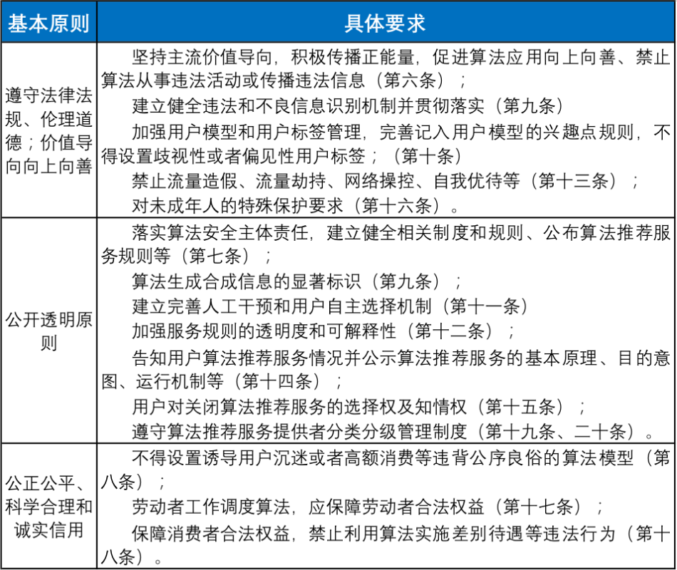 對于算法合規的原則和方法,國家網信辦于今年8月27日發布了《互聯網信息服務算法推薦管理規定(征求意見稿)》,對應用算法推薦技術[5]提供互聯網信息服務的基本原則、基本管理制度作了較為全面而系統的規定。這也可以作為企業建立算法合規的一個重要參考,現將其主要內容整理如下: