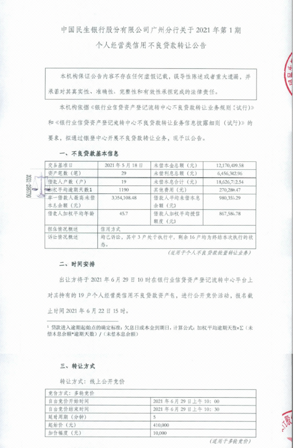 近日,民生銀行在銀登網(wǎng)發(fā)布民生銀行廣州分行關(guān)于2021年第1期個人經(jīng)營類信用不良貸款轉(zhuǎn)讓公告。