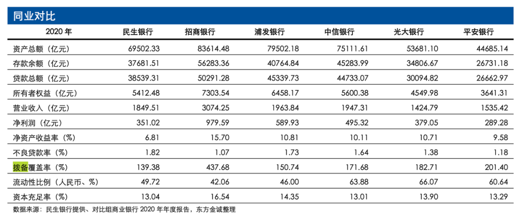 值得一提的是,民生銀行在去年末撥備覆蓋率低于150%,并處于同業(yè)較低水平。