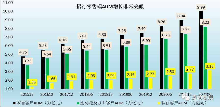 2、實際上從絕對值上來說,招行零售端AUM(這里的AUM均為月日均口徑)亦非常亮眼,遠遠超過同業(yè)水平,2021年6月底招行零售客戶AUM達到9.985萬億元(時點規(guī)模已突破10萬億元大關)、金葵花及以上客戶AUM達到8.22萬億、私行客戶AUM達到3.13萬億。相較于2020年底,今年上半年零售客戶AUM、金葵花及以上客戶AUM和私行客戶AUM的增量分別達到1.04萬億、0.88萬億和0.35萬億。