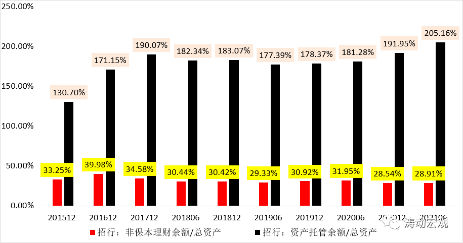 1、招行特別重視表外業(yè)務,這從FPA內涵、非保本理財以及資產托管等方面便可以看出來。2021年6月底,招行的非保本理財規(guī)模和資產托管規(guī)模分別達到25685.77億元和18.23萬億,占其總資產的比例分別達到28.91%和205.16%。