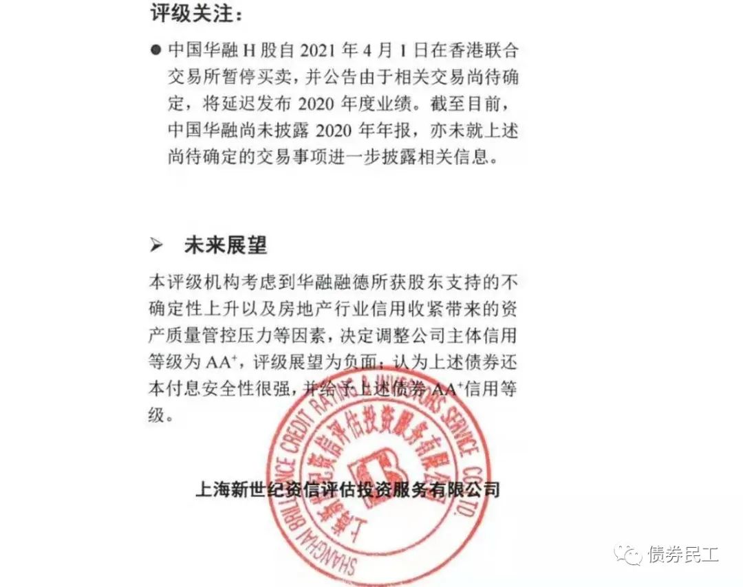 根據(jù)最新的跟蹤評(píng)級(jí)報(bào)告,華融融德資產(chǎn)管理有限公司(以下簡稱“華融融德”)的主體信用評(píng)級(jí)由AAA下調(diào)至AA+,評(píng)級(jí)展望為負(fù)面。華融融德的評(píng)級(jí)展望在2021年4月16日已經(jīng)被調(diào)整為負(fù)面。