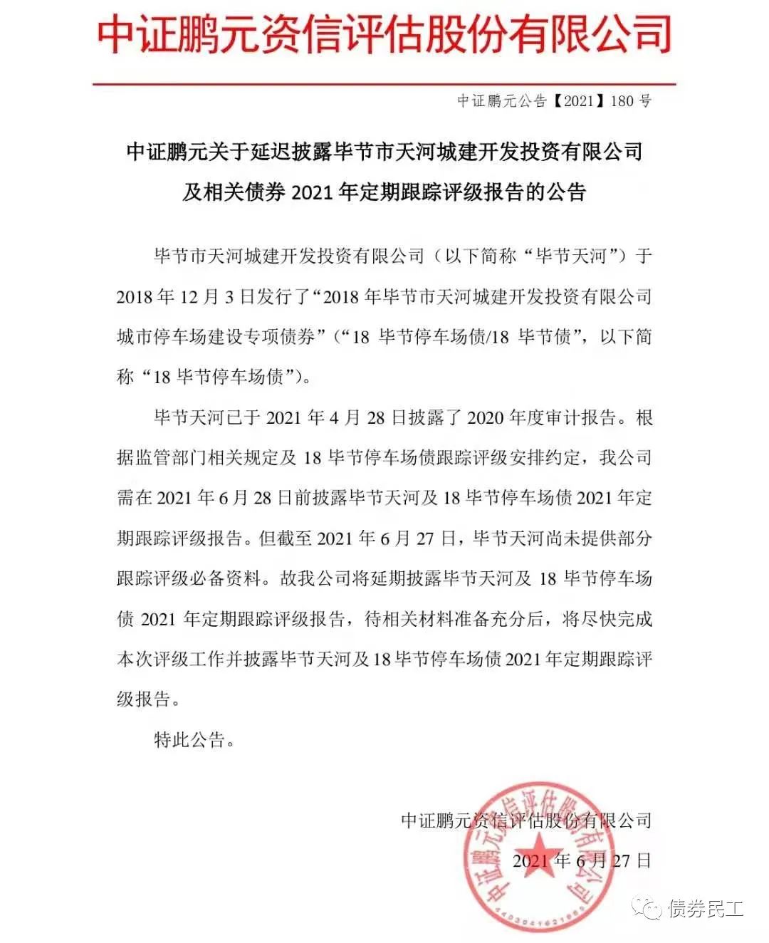 3、畢節(jié)市天河城建開發(fā)投資有限公司(以下簡稱“畢節(jié)天河城建”)未提供部分跟蹤評(píng)級(jí)必備資料,延遲披露跟蹤評(píng)級(jí)報(bào)告。在畢節(jié)天河城建2020年年報(bào)已經(jīng)出具且無重大特定事項(xiàng)的情況下,這種跟蹤評(píng)級(jí)報(bào)告延遲披露的情況并不常見。