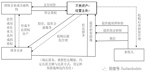 在《企業(yè)會計準(zhǔn)則第12號——債務(wù)重組》的規(guī)定中,債務(wù)重組要求在不改變交易對手方的情況下進(jìn)行交易,但在實踐中經(jīng)常出現(xiàn)第三方參與相關(guān)交易的情形,也即以不同于原合同條款的方式代債務(wù)人向債權(quán)人償債,或新組建的公司承接原債務(wù)人的債務(wù),從不良資產(chǎn)經(jīng)營的角度,債務(wù)重組的業(yè)務(wù)開展要首先完成不良資產(chǎn)債權(quán)的收購,在收購?fù)瓿珊笤賳觽鶆?wù)重組業(yè)務(wù)。