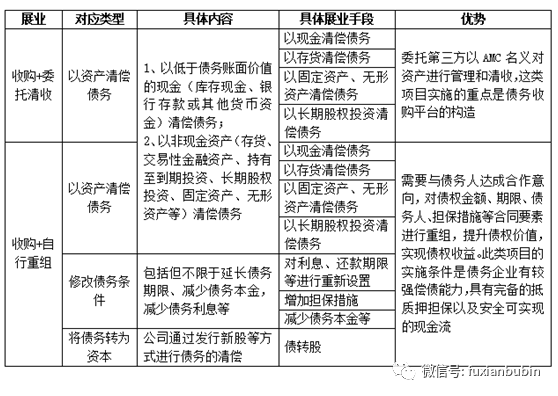 根據(jù)《企業(yè)會計準(zhǔn)則第12號——債務(wù)重組》第3條規(guī)定,債務(wù)重組主要包括“以資產(chǎn)清償債務(wù)、將債務(wù)轉(zhuǎn)為資本,修改其他債務(wù)條件(包括但不限于延長債務(wù)償還期限、延長債務(wù)償還期限并加收利息、延長債務(wù)償還期限并減少債務(wù)本金或債務(wù)利息),或以上手段的綜合使用”。在不良資產(chǎn)經(jīng)營業(yè)務(wù)視角下,債務(wù)重組業(yè)務(wù)可做如下對應(yīng):