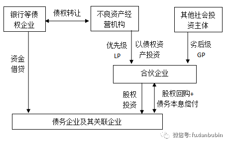 如果項目較為復(fù)雜,需要資金量較多,在這種情況下,可以考慮通過設(shè)立基金的方式(以合伙制私募基金為主)進(jìn)行債務(wù)重組,根據(jù)“私募新規(guī)”規(guī)定,私募股權(quán)投資基金的股權(quán)和債權(quán)以不超過8:2的比例進(jìn)行投資。具體交易結(jié)構(gòu)如下圖:
