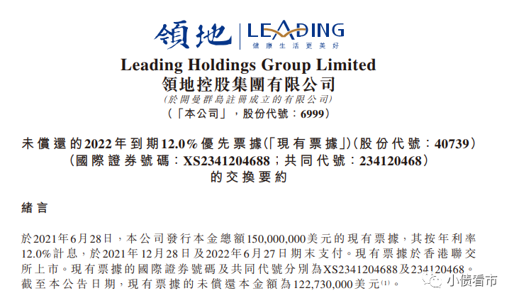 公告顯示,2021年6月28日領地控股發行本金總額1.5億美元的現有票據,票息12.0%,于2021年12月28日及2022年6月27日期末支付。截至本公告日期,現有票據的未償還本金額為1.23億美元。