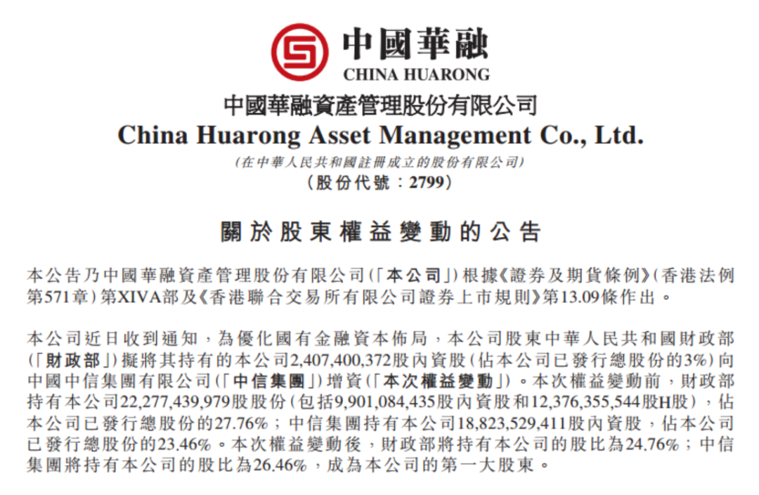 三個(gè)月后,華融第一大股東財(cái)政部將其持有的公司約24.07億股向中信集團(tuán)增資,中信集團(tuán)持股比例增至26.46%成為第一大股東,財(cái)政部直接持股則降為24.76%。