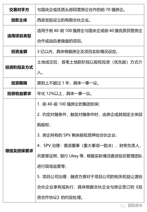 (1)投資架構:西政(GP)與指定主體(LP)共同成立有限合伙企業,合伙企業受讓小股東持有的SPV公司99%的股權,SPV公司與強主體房企共同持有項目公司的股權。