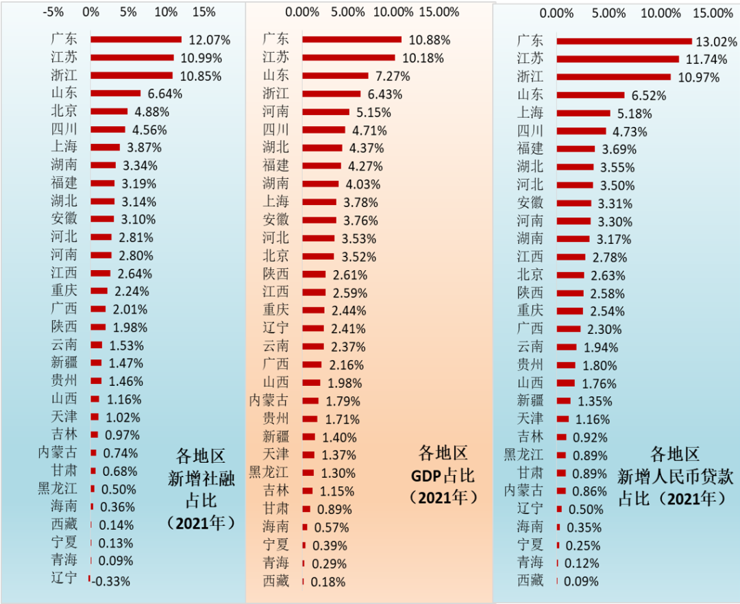 具體看,2021年廣東與浙江的GDP份額分別為10.88%與6.43%(合計占比17.31%),但其獲得的社融支持份額卻分別達(dá)到12.07%與10.85%(合計占比達(dá)到22.92%),獲得的人民幣貸款支持份額亦分別高達(dá)到13.02%和10.97%(合計占比達(dá)到23.99%)。