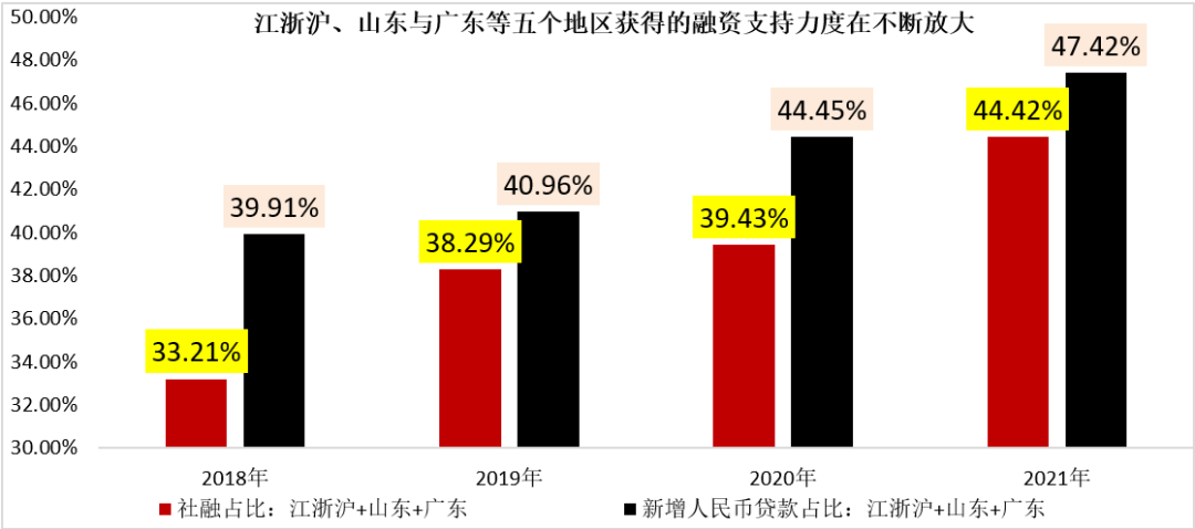 (一)五個地區(qū)合計獲得了全國44%以上的社融和47%以上的貸款支持