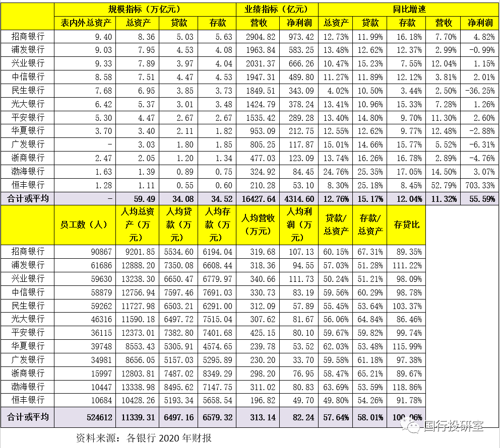12家股份行共擁有52.46萬名員工,總資產、貸款與存款合計分別為59.49萬億、34.08萬億、34.52萬億,合計實現16248億元營收和4315億元凈利潤。