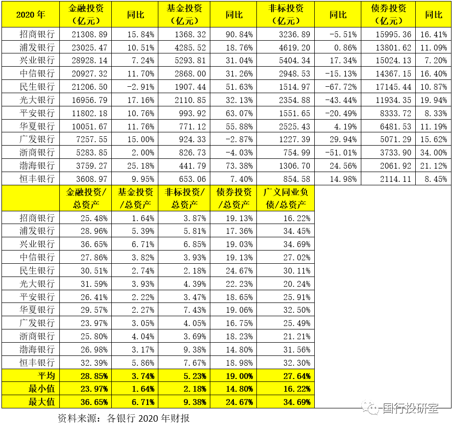 特別是從增速上看,2020年民生銀行、浙商銀行、光大銀行、平安銀行、中信銀行、招商銀行等均在壓降非標投資規模,尤以民生銀行與光大銀行最為明顯。而對于債券投資和基金投資而言,股份行普遍加大了配置力度,這表明金融投資的內部結構調整是股份行正在做的事情。