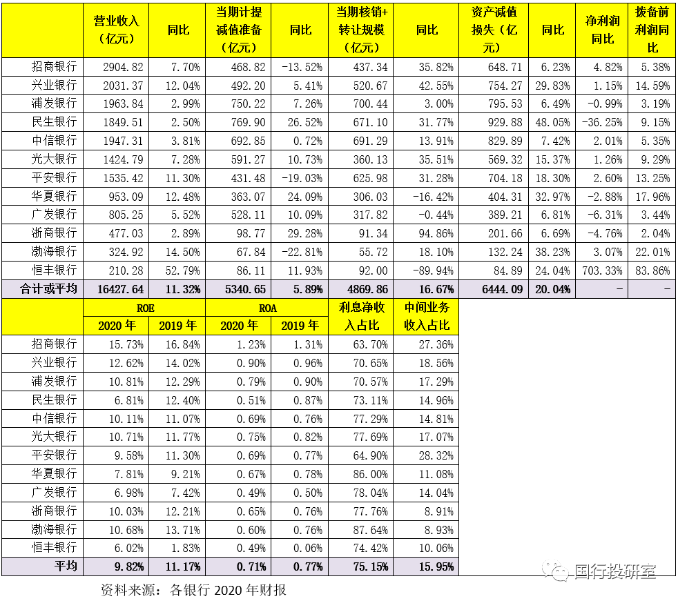 (3)2020年恒豐銀行的營收和凈利潤同比分別大幅增長52.79%和703.33%,這主要是因為其基數較低,有特殊原因。如2018-2020年的營業收入分別為160.35億元、137.63億元和210.28億元,2018-2020年的凈利潤分別為5.35億元、6.61億元和53.10億元,2019-2020年的不良資產處置金額(含核銷+轉讓)分別高達914.61億元和92億元。