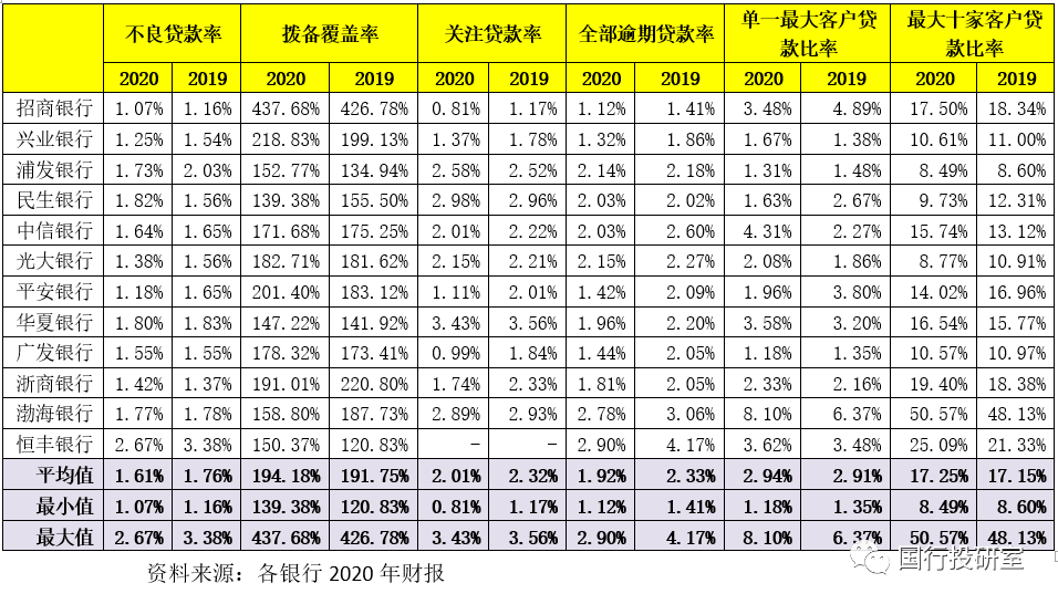 截至2020年底,12家股份行的不良貸款率、撥備覆蓋率、關注貸款率和逾期貸款率平均分別為1.61%、194.18%、2.01%和1.92%,較2019年均有明顯改善。