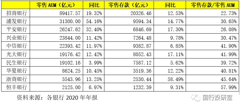七、最能體現零售綜合服務能力的指標:零售AUM(招行一騎絕塵)