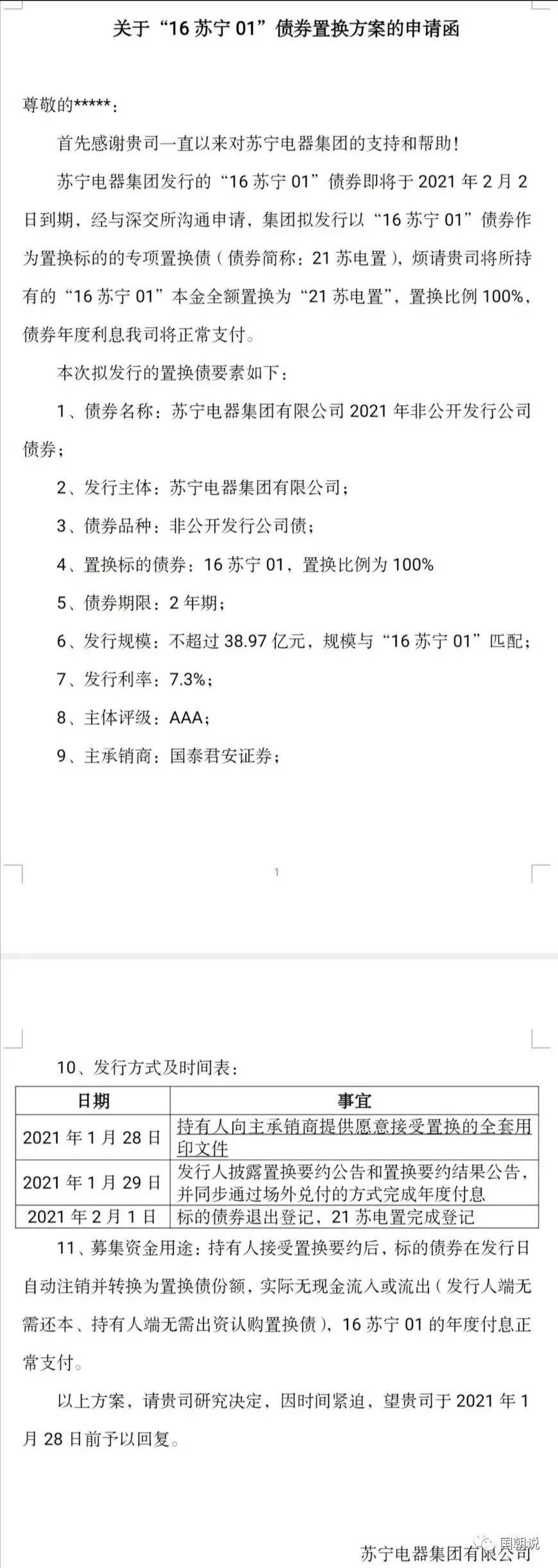 1月26日晚,一份《關于“16蘇寧01”債券置換方案的申請函》在各大群迅速傳播,引起廣泛關注,蘇寧在本月初提前兌付了100億債券后,似乎有點撐不住了。