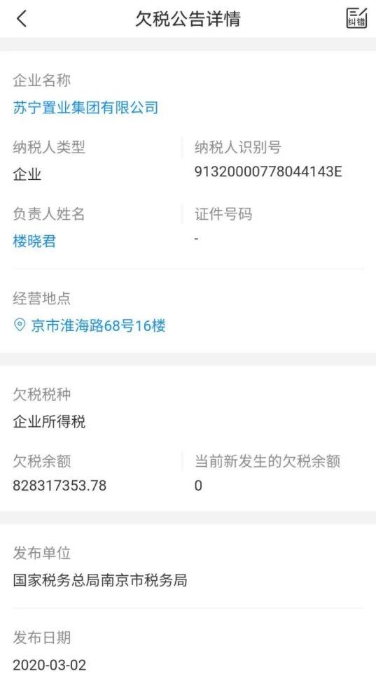 小編第一次關注到蘇寧,是源于去年3月份南京市稅務局發布的一份欠稅公告,截至到2019年12月31日,蘇寧置業拖欠企業所得稅8.28億。