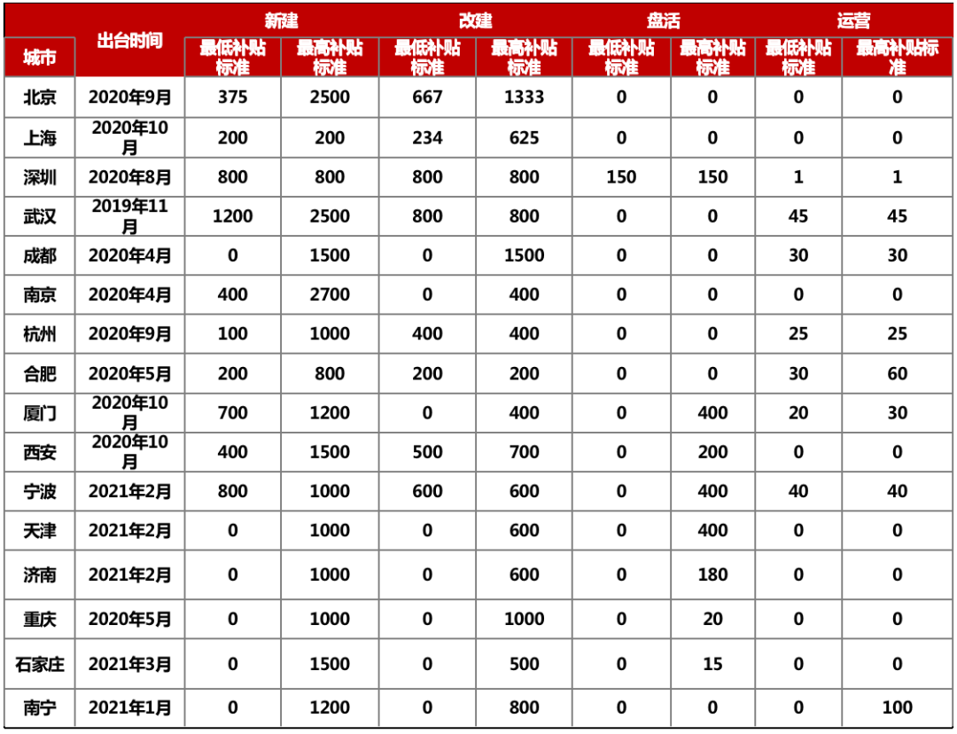 截至目前,在中央財政支持住房租賃市場發展試點入圍的24個城市中,已經有16個城市(北京、上海、深圳、武漢、成都、南京、杭州、合肥、廈門、西安、寧波、天津、濟南、重慶、石家莊、南寧)已經公布了中央財政支持住房租賃市場發展試點專項資金管理辦法,因城施策,不同城市之間補貼標準差異較大。整體來看,補貼以新建、改建類項目補貼為主,部分城市對盤活類、運營類項目有補貼。