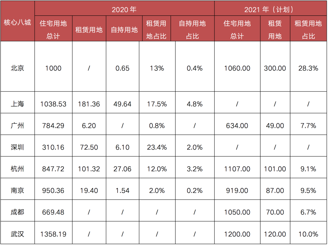 在克而瑞租售長期關注的核心八城中,以一線城市北京為例,從2021年北京的供地計劃可以看出,2021年北京將持續增加住宅用地供應量,提高租賃住宅用地占比。具體來看,2021年計劃安排住宅用地1060公頃,較2020年計劃安排量增加60公頃。與此同時,土地供應向租賃住宅傾斜,在單列租賃住宅用地的基礎上,按照商品房供應下限等比例安排租賃住宅供應指標,將租賃住宅占住宅用地比重由2020年的13%提高到28.3%。
