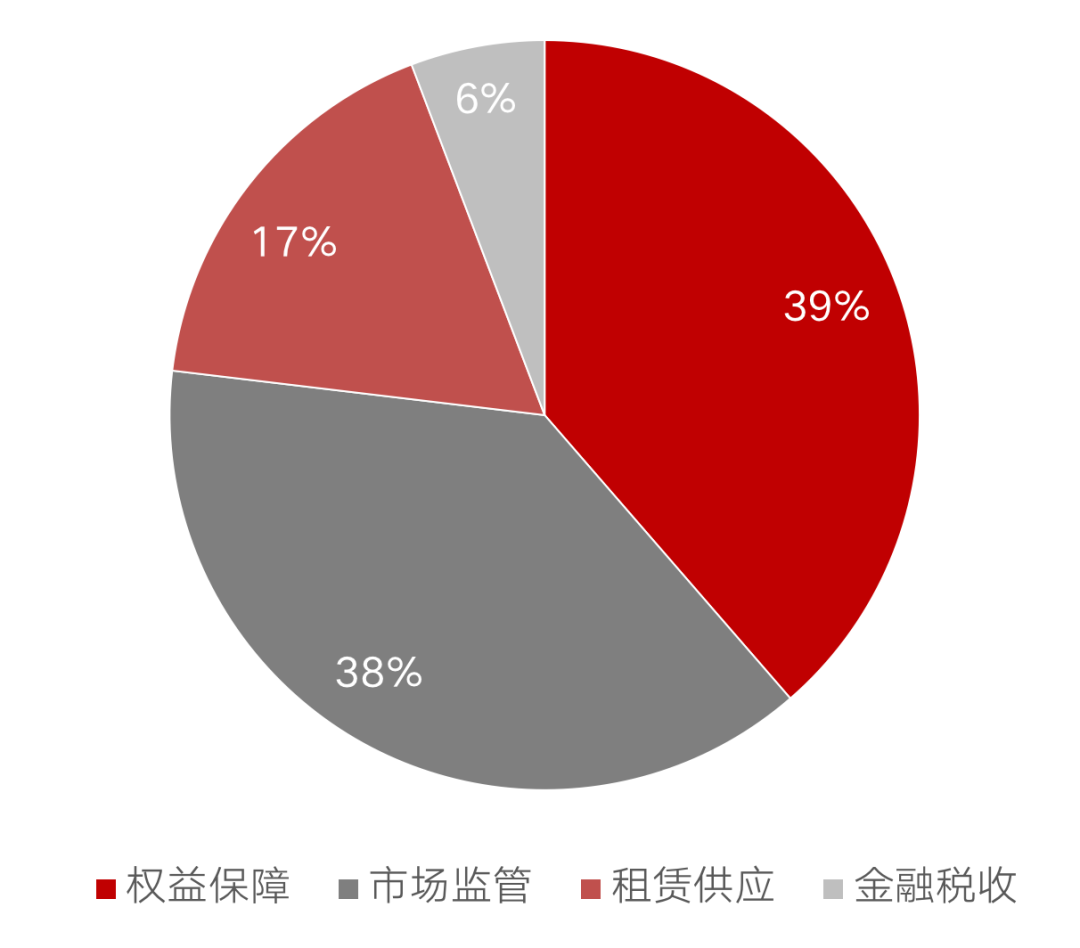 2020年1月至2021年第一季度,我國46城累計出臺租賃相關政策277條,其中權益保障類占比最高,占比39%。