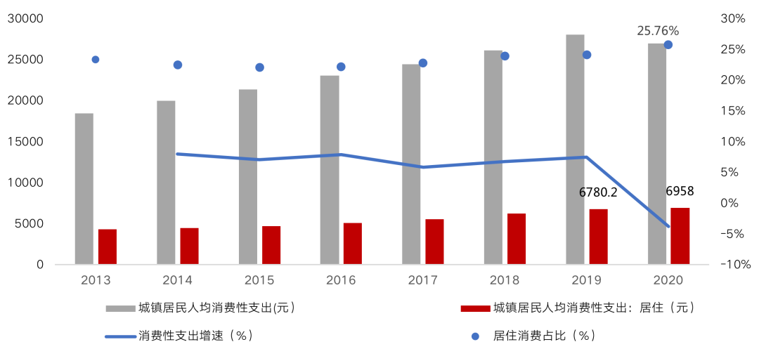 自中國經濟發展模式由投資驅動逐步轉為重視消費驅動以來,我國國民消費水平一直保持著穩定的增長速度。2020年,我國城鎮居民人均消費支出27007元,與2013年相比增長了46.08%,其中25.76%為居民居住性消費支出。