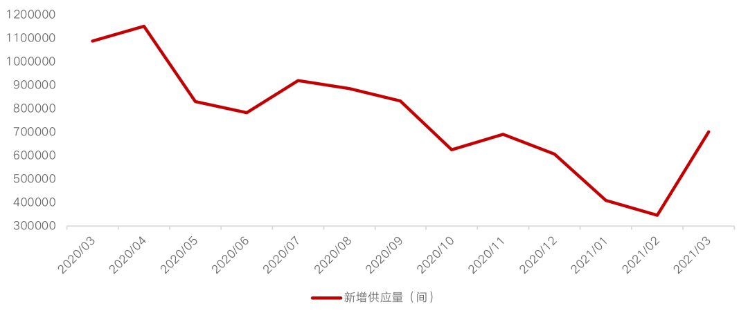 房源供應層面,由于各地城市鼓勵員工留城過春節,大大減少了房源空置現象,因此1-2月各城市新增供應房源大幅下跌:1月,55城個人房源新增供應407218間,環比下跌32.66%,2月新增供應344347間,環比下跌15.44%。伴隨疫情逐步好轉,抑制的租賃需求得以釋放,加之年底大批租賃房源租期到期,3月整體新增供應顯著提升,環比上升103.65%。