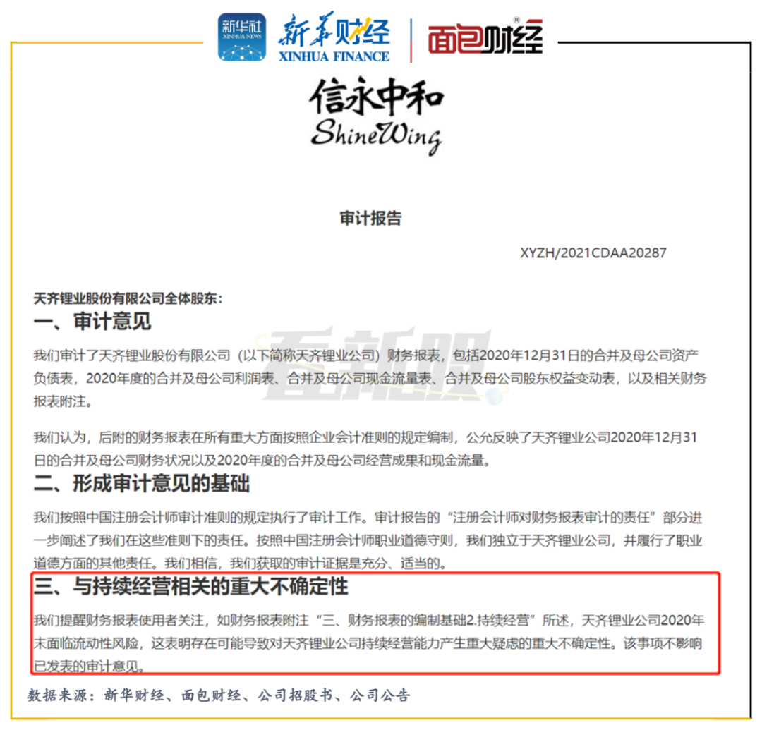 天齊鋰業的審計師信永中和在2019年和2020年出具的審計報告中,均提及公司“面臨流動性風險,這表明存在可能導致對天齊鋰業公司持續經營能力產生重大疑慮的重大不確定性”。