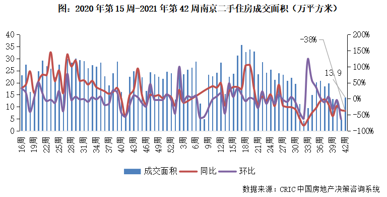2021年第42周,南京二手住房成交面積收13.9萬平方米,環比增長203%,同比跌幅38%。自4月高點以來市場震蕩下行,本周南京市場體量底部反彈但距離前期仍有較大差距,疊加同比跌幅保持在較高位,后市或企穩小幅回升。